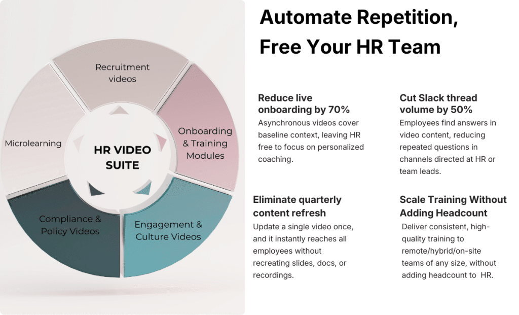 Where video helps: Video training is engaging, repeatable, and measurable. With HR Video Suite, HR leaders can roll out compliance or skills training in a format employees actually pay attention to. Videos can be revisited anytime, cutting down on repetitive questions and saving HR teams countless hours.
